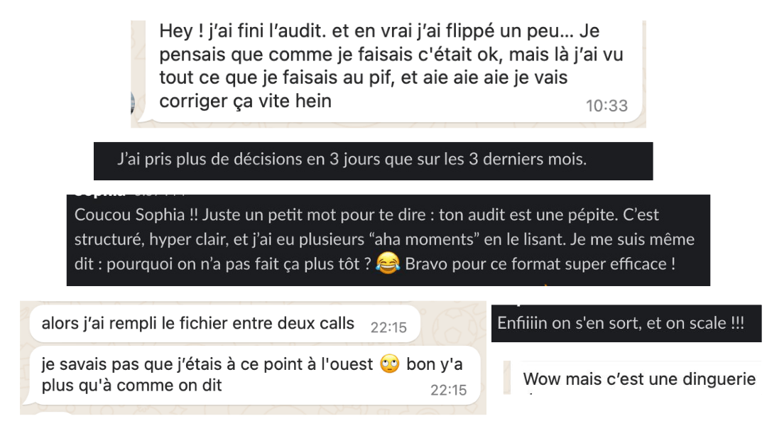 ✅ Tu suis mes recommandations concrètes et priorisées pour structurer ton business